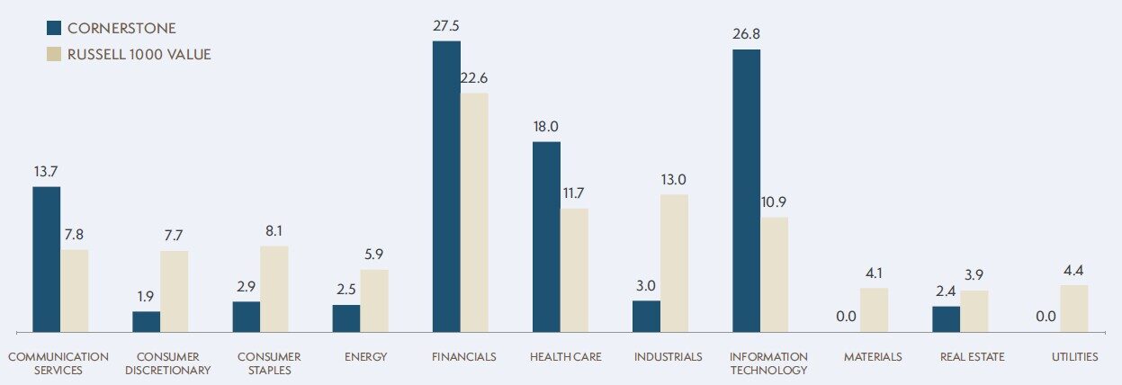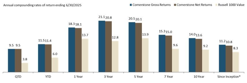 Concentrated 30 Institutional Composite contains fully discretionary institutional accounts that are typically comprised of 27-35 securities that may or may not pay dividends and are suitable for those clients with an emphasis on long-term capital appreciation and have an above-average risk tolerance. For comparison purposes the composite is measured against the Russell 1000 Value Index. Cornerstone Investment Partners’ has constructed a universe of 800 large, liquid securities, including non-US companies, traded on US exchanges. Cornerstone Investment Partners, LLC is an independent, employee owned investment advisory firm. The firm maintains a complete list and description of composites, which is available upon request. Results are based on fully discretionary accounts under management, including those accounts no longer with the firm. Past performance is not indicative of future results. N.A.- Information is not statistically meaningful due to an insufficient number of portfolios in the composite for the entire year. The U.S. Dollar is the currency used to express performance. Returns are presented gross and net of management fees and include the reinvestment of all income. Gross returns were reduced by transaction costs. Net of fee performance was calculated using actual management fees, a model fee based on the standard investment advisory schedule was applied to non-fee paying accounts. Beginning October 1, 2008, composite policy requires the temporary removal of any portfolio incurring a client initiated significant cash inflow or outflow of 30% of portfolio assets. The Concentrated 30 Composite was created on April 1, 2010. The annual composite dispersion is an asset-weighted standard deviation calculated for the accounts in the composite the entire year. Cornerstone Investment Partners claims compliance with the Global Investment Performance Standards (GIPS®) and has prepared and presented this report in compliance with the GIPS standards. Cornerstone Investment Partners has been independently verified for the periods September 30, 2001 thru December 31, 2024. A firm that claims compliance with the GIPS standards must establish policies and procedures for complying with all the applicable requirements of the GIPS standards. Verification provides assurance on whether the firm’s policies and procedures related to composite and pooled fund maintenance, as well as the calculation, presentation, and distribution of performance, have been designed in compliance with the GIPS standards and have been implemented on a firm-wide basis. The Concentrated 30 composite has had a performance examination for the periods September 30, 2001 thru December 31, 2024. The verification and performance examination reports are available upon request. Benchmark returns are not covered by the report of independent verifiers. As of January 1, 2007, the composite was split into a tax sensitive composite and a non-tax sensitive composite to better reflect our performance for each account type. Policies for valuing investments, calculating performance, and preparing GIPS Reports are available upon request. Submit requests to Cornerstone Investment Partners: 3438 Peachtree Rd, Suite 900. Atlanta, GA 30326; Phone: 404-751-3850; Email: marketing@cornerstone-ip.com. The general fee schedule for equity accounts is as follows: 0.55% on the first $20,000,000; 0.45% on the next $20,000,000 and 0.35% on the balance. Actual investment advisory fees incurred by clients may vary. GIPS® is a registered trademark of CFA Institute. CFA Institute does not endorse or promote this organization, nor does it warrant the accuracy or quality of the content contained herein. Due to the marketing rule that went into effect on 11/4/22, the net returns were updated to comply with this regulation. Additional information is available upon request.
